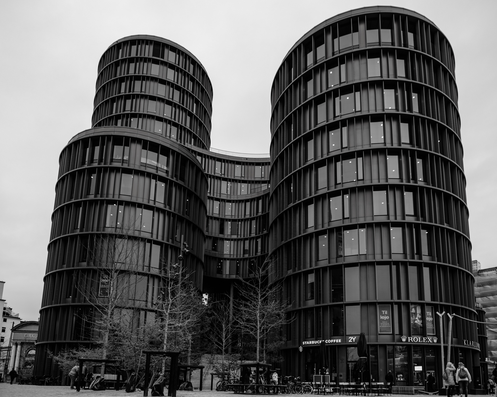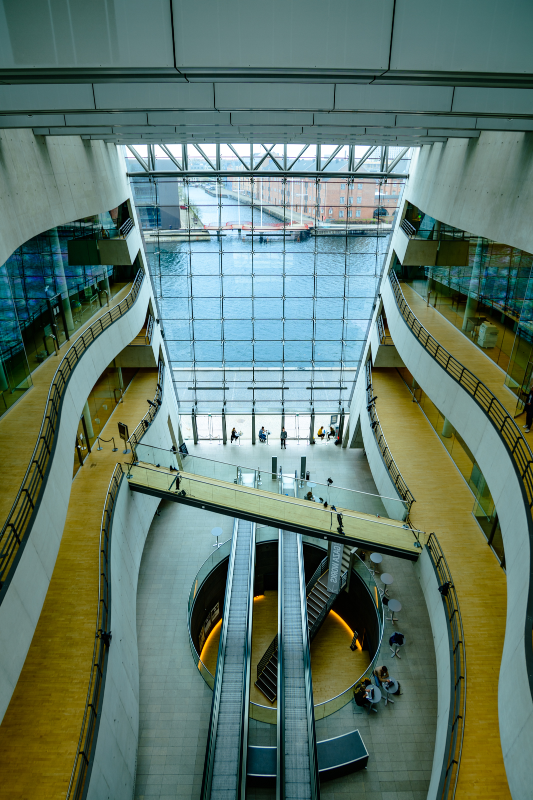 Der Anbau zur klassischen Königlichen Bibliothek ist ein absolutes Schmuckstück der Architektur mit seiner schwarzen reflektierenden Fassade aus Granit. Den besten Blick auf das Atrium und das Wasser hinter den Fenstern hat man von einem der höheren Stockwerke.